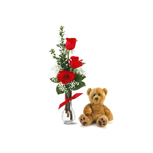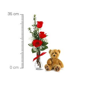 3 Rosas rojas en florero con oso pequeño de aprox 20cm sentado.