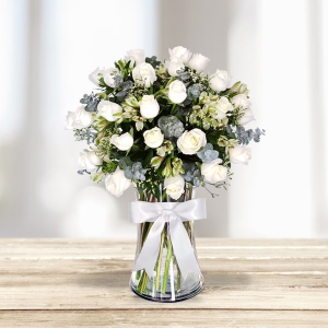 24 Rosas elegantemente arregladas en florero de vidrio.