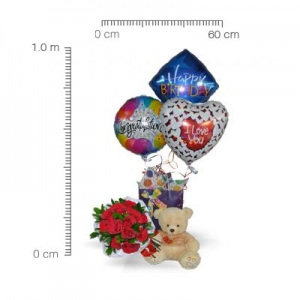 Oso de peluche (25cm sentado), 3 Globos metálicos medianos con gas, y ramo de 12 Rosas. Favor de especificar en las instrucciones de entrega el tema de los globos.