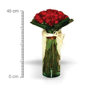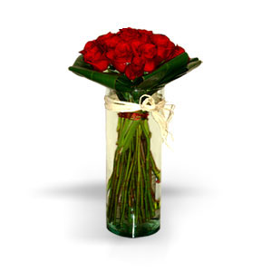 Arreglo de 24 Rosas en atado con follaje en florero cilindrico.