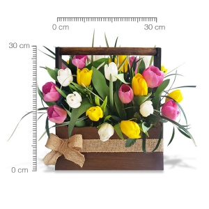 30 tulipanes de colores en base de madera tipo canasta con asa.