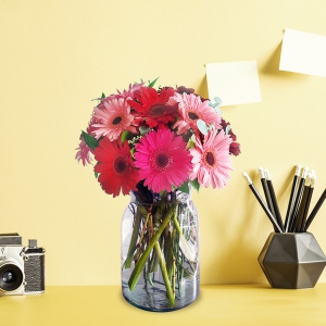 Llena de color su día con este arreglo de 10 gerberas premium en florero de vidrio tipo lechero.