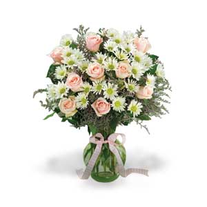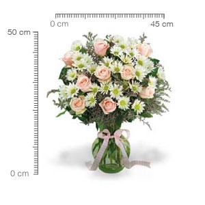 Arreglo de 12 Rosas con Margaritas en florero de vidrio