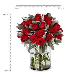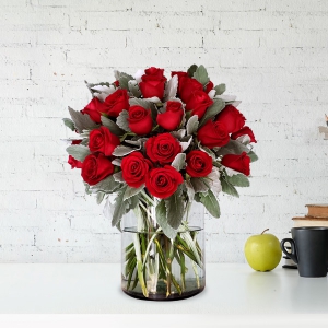 Definitivamente un arreglo muy original, 24 Rosas y follaje Dusty Miller en florero de vidrio cilíndrico.
