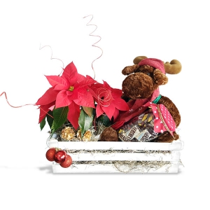 Original regalo navideño con reno de peluche, 1 nochebuena chica y un mason jar de 16oz lleno de chocolates hershey mini.