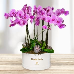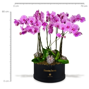 Espectacular arreglo con 14 tallos de Orquídea Phalaenopsis premium en 2 tonos. El tono de morado a rosa varia de acuerdo a la disponibilidad, simpre seleccionaremos las mejores orquideas disponibles al momento.
