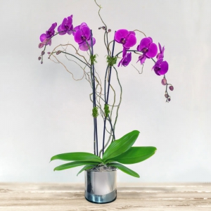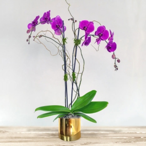 Orquídea Phalaenopsis premium morada de 2 tallos en base de vidrio dorada.