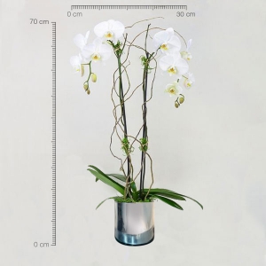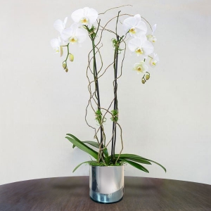 Orquídea Phalaenopsis premium blanca de 2 tallos, o un tallo con dos ramificaciones en base de vidrio plateada.