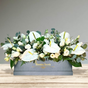 Elegante arreglo con anturios rosas y lisianthus en base de madera rotulada