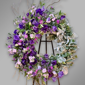 Acompaña la partida de un ser querido con esta corona vanguardista con lisianthus y follajes finos en tripié.
