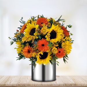 Illumina su día con nuestro arreglo de 10 girasoles, 10 gerberas y margaritas presentado en un florero de vidrio platinado.