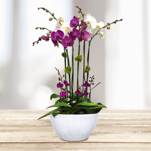 Arreglo con 4 tallos de orquíde phalaenopsis y 4 tallos de orquídea phalaenopsis mini , en base de cerámica.