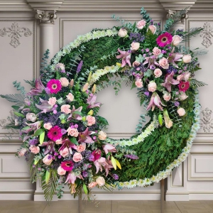 Elegante corona de colores grande para funeral con rosas y orientales de invernadero .
