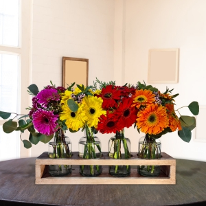 Arreglo de 20 gerberas en original base de madera con 4 floreros de vidrio.