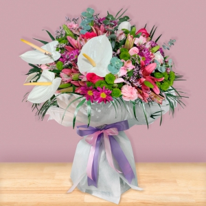 Bouquet de anturios, rosas, lilis y flores mixtas en papel coreano.
