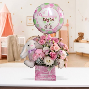 Recibe a el nuevo integrante de la familia con este regalo compuesto de chocolates, peluche, flores y globo.