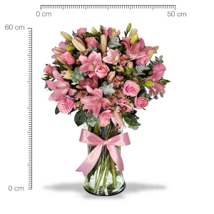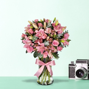 Arreglo de flores mixtas tonos color rosa en florero de vidrio.