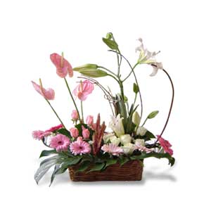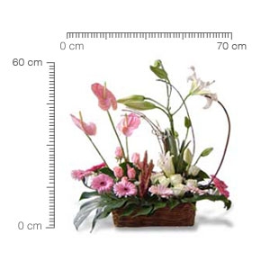 Fino diseño en tonos pastel con Anturios, Gerberas , Rosas y Casa Blanca.