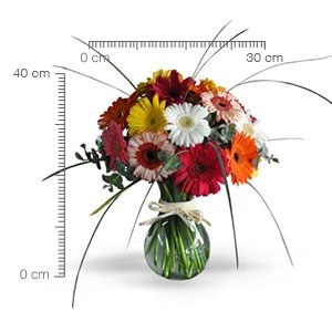 Arreglo de 20 gerberas de colores en florero de vidrio.