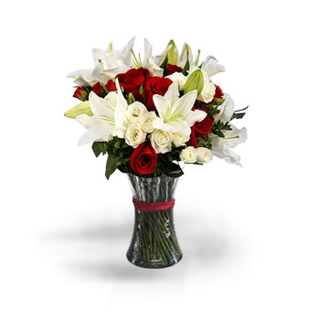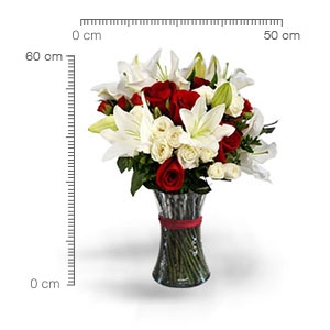 Moderno diseño de temporada con rosas, lilis y flores en tonos rojo y blanco, presentado en florero de vidrio.