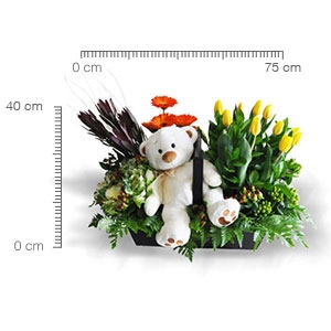 Arreglo con 10 tulipanes, gerberas, oso de peluche y follajes finos en base de madera tipo canasta con asa.