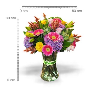Arreglo de flores mixtas selectas en florero de vidrio con original moño.