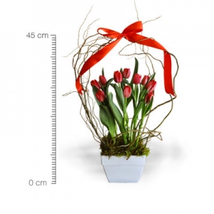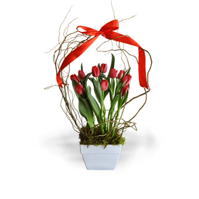 Original arreglo de 10 tulipanes en base de cerámica con curly.