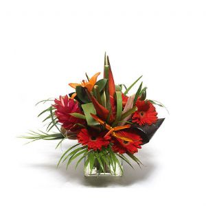 Arreglo de flores mixtas en florero de vidrio en forma de cubo.