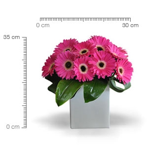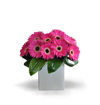 Moderno diseno de 20 gerberas con hojas en florero blanco (Color de las gerberas sujeto a disponibilidad)