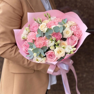 Un bouquet que expresa la dulzura y el encanto de una persona especial con 12 rosas, 5 lisianthus y complementos en tonos pastel.