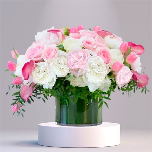 Transforme cualquier espacio con nuestro exquisito arreglo floral Calas, Tulipanes, Lisianthus & Rosas, cuidadosamente diseñado para capturar la esencia de la perfección natural. Este hermoso arreglo está presentado en un elegante floreró de vidrio transparente, resaltando la belleza de cada flor.