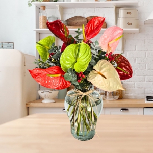 Arreglo de 10 anturios en un elegante florero de vidrio, diseñado para añadir un toque de frescura y sofisticación a cualquier espacio. Con su forma distintiva y colores vibrantes, los anturios son la elección perfecta para quienes buscan un elemento decorativo que destaque y sorprenda.