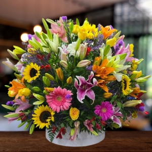 Un arreglo floral majestuoso y lleno de vida, diseñado para impresionar. Compuesto por una gran variedad de flores finas y complementos elegantes, este diseño ofrece una explosión de color, armonía y estilo. Todo montado en una base redonda tipo caja, que le aporta un toque sofisticado.Con su gran tamaño, es perfecto para celebraciones especiales, decoraciones de impacto o como un regalo inolvidable.