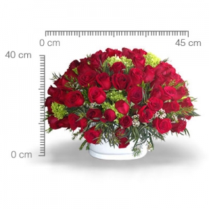 Elegante arreglo de 72 rosas calidad Platinum con finos follajes, en florero de cerámica de alta temperatura.