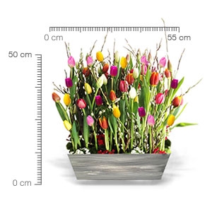Sorpréndele con este fino y colorido arreglo con 100 tulipanes holandeses de colores, en base de madera color gris.