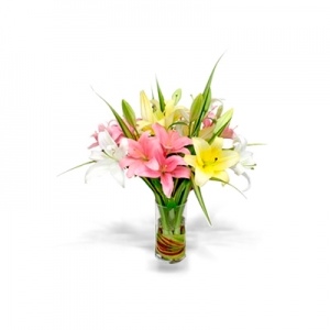 Si lo que buscas es solo un detalle, este es el arreglo perfecto.6 tallos de lilis en un florero pequeño de vidrio.