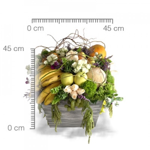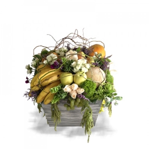 Innovador arreglo arreglo frutal con flores y follajes en base de madera gris.