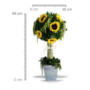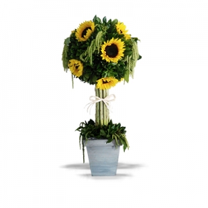Expresión topiaria con 10 girasoles en base de madera deslavada tono gris al estilo Shabby Chic.