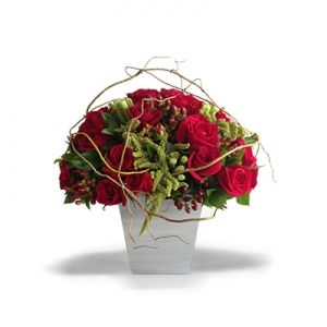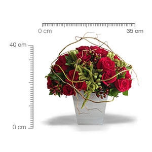 Arreglo de 24 rosas inspirado en la decoración de las grandes casas de campo de Gran Bretaña, mezclando elementos antiguos con modernos de acuerdo a la tendencia Shabby chic. Dimensiones aproximadas: 40cm de alto x 35cm de ancho.