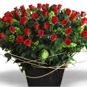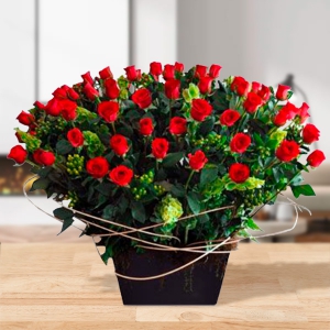 Original arreglo de 100 rosas calidad platinum y follajes finos en base.
