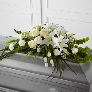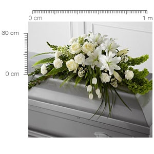 Resurrección, Cubre Cajas que inspira pensamientos de consuelo y paz a aquellos que deseen presentar sus respetos por la pérdida de la persona fallecida. Tulipanes blancos, rosas, lils, orientales, son acentuados por el verde brillante de tallos de campanas de Irlanda y un surtido de los mejores exuberante vegetación para crear la perfecta armonía que se mostrará en la parte superior de el ataúd durante el servicio de despedida final. Medida aproximada. 60 cm de ancho por 80 cm de largo. |