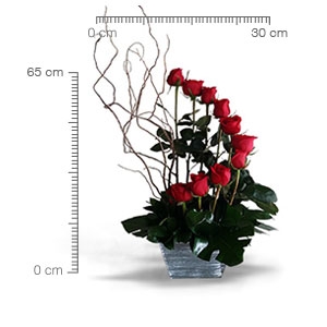 Cautívala y enamorala con este moderno arreglo de 12 rosas en base de madera deslavada.Tamaño aproximado 55 cm de alto por 40 cm de ancho.