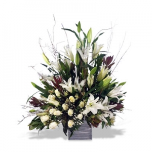 El blanco es un color absoluto, significado de luz, unidad, paz y pureza. 12 Rosas y 10 tallos de orientales blancos en este elegante arreglo.