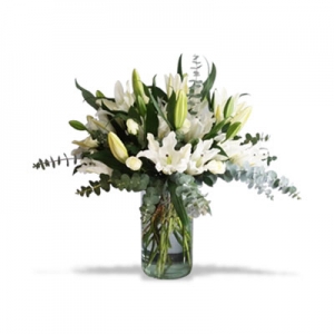 Para ese momento culminante en la plenitud de la vida. Arreglo con 10 tallos de orientales blancas y 12 rosas en florero de vidrio.