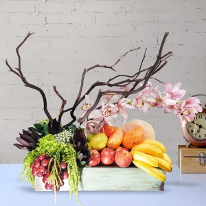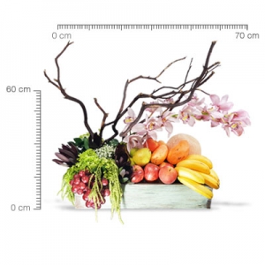 De nuestra linea Premium, este arreglo con orquídea Cymbidium importada de Holanda y fruta de temporada adquirida el mismo día que se hace su entrega especialmente para su arreglo.