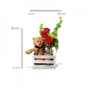 Un detalle muy completo, 3 rosas en florero y oso pequeño en base de madera deslavada.
