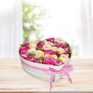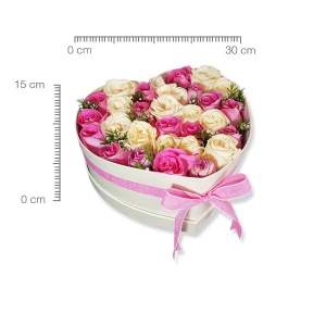 Elegante y romántico corazón con 25 rosas en tonos del rosa al blanco.