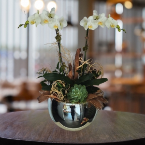 Elegante arreglo con una orquídea phalaenopsis premium en base de vidrio soplado metalizado con finos follajes.